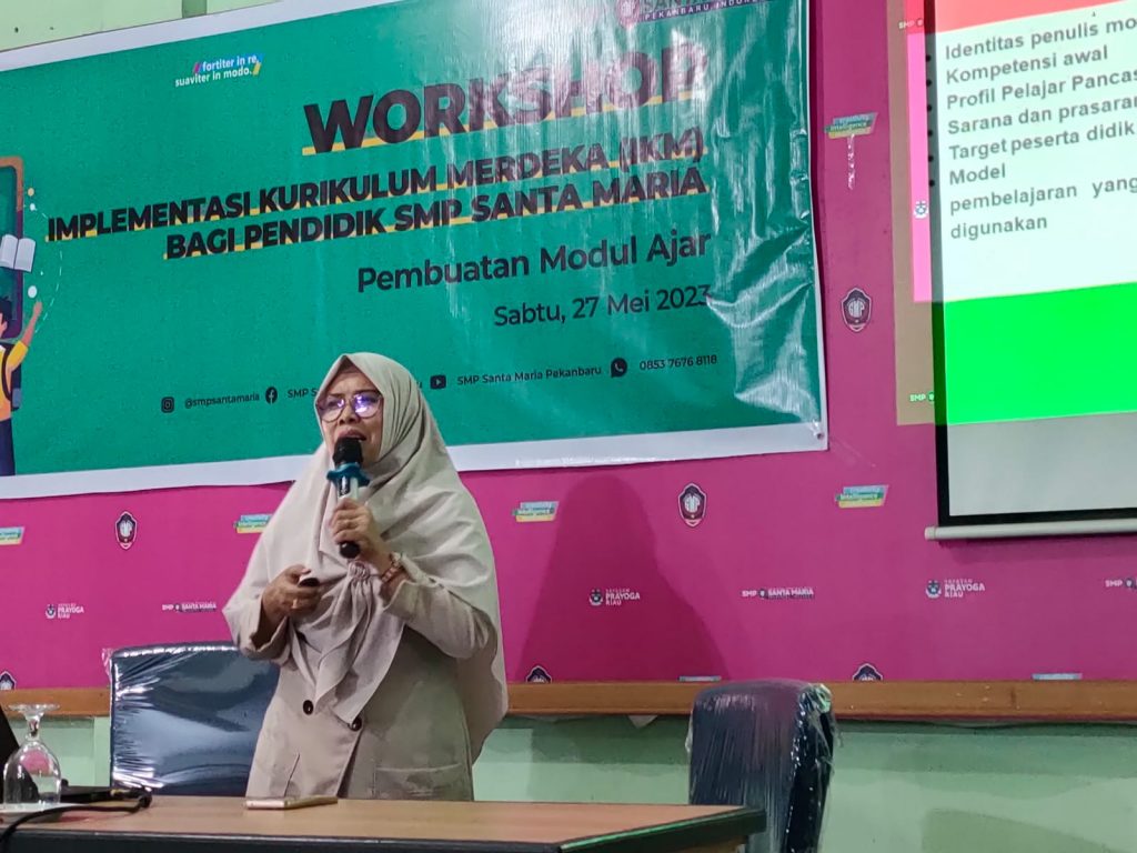 Sabtu (27/5) dilaksanakan Workshop Implementasi Kurikulum Merdeka (IKM) bagi Bapak/Ibu pendidik SMP Santa Maria. Adapun narasumber pada workshop kali ini ialah Ibu Nurjasmi, M. Pd selaku Fasilitator Guru Penggerak Dinas Pendidikan. Dalam penyampaiannya, beliau meriview terlebih dahulu tentang perubahan paradigma guru yang harus dilakukan untuk dpaat mengimplementasikan IKM dan juga penggunaan Fase D pada pembelajaran IKM yang harus didiskusikan bersama guru-guru MGMP untuk dapat membedah materi ajar yang akan disampaikan selama 3 tahun pendidikan di tingkat SMP dari Fase D tersebut. Kemudian barulah dapat dibuat modul ajar.